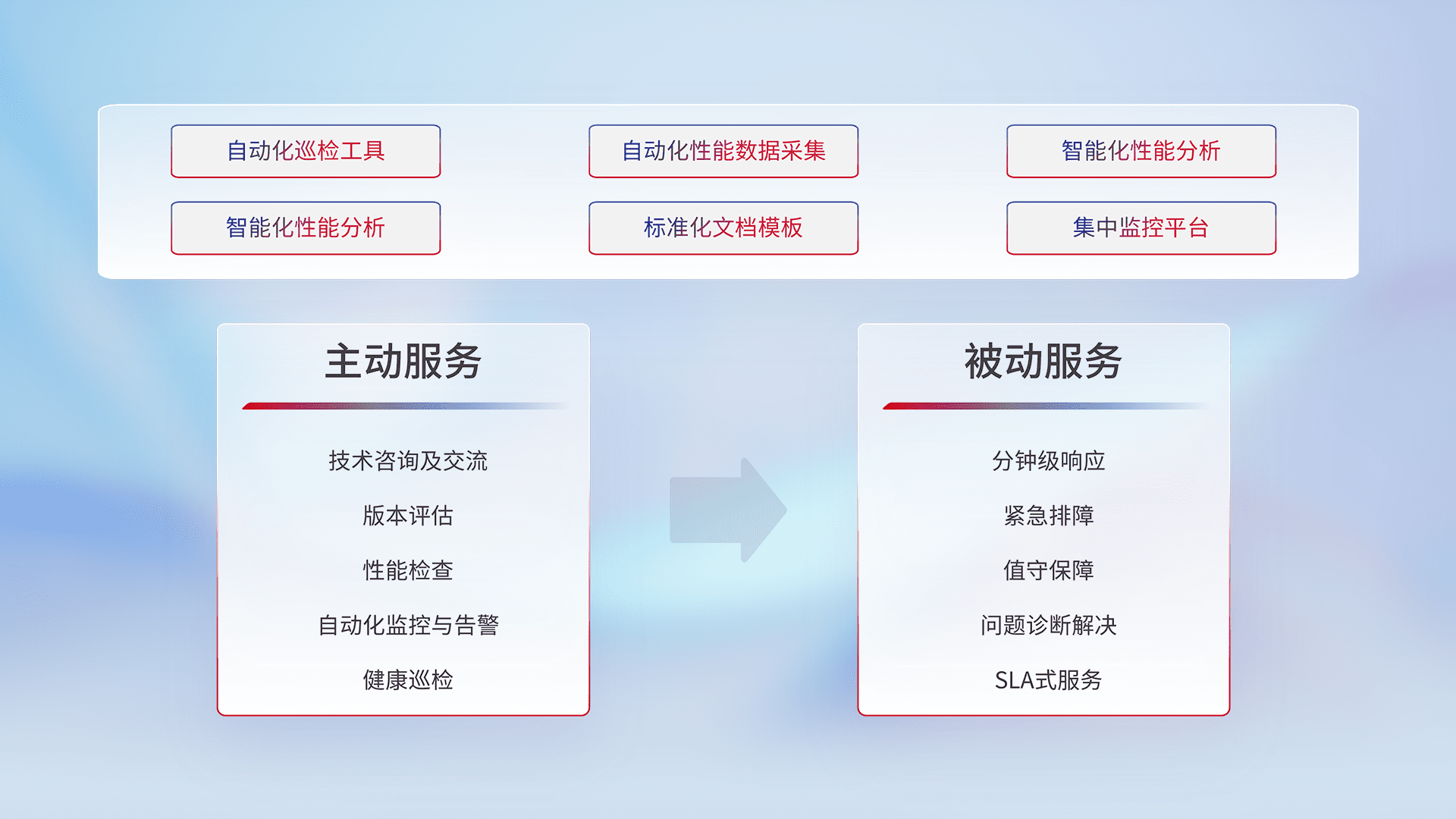 智能化工具和标准化文档,,保障服务质量,,提供主动服务(包含技术咨询、、版本评估、、性能检查、、自动化监控与告警、、健康巡检)和被动服务包含(分钟级响应、、、、紧急排障、、、、值守保障、、、问题诊断解决、、、SLA服务)。。。。