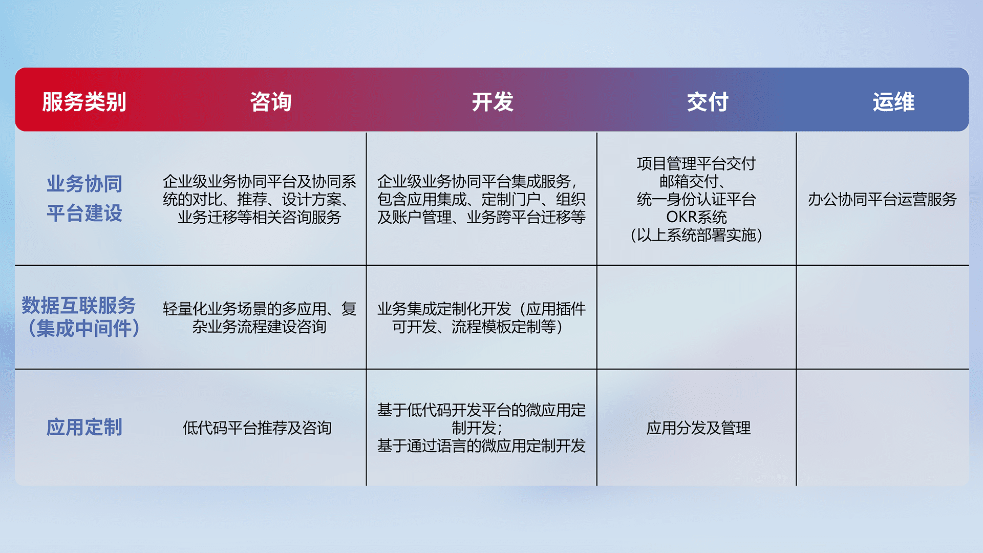 针对钉钉、、企微、、、、IDaas等平台级产品提供产品的规划、、、方案、、交付、、、、定制化开发等服务,,,,实现如统一协同办公、、智能客户服务、、、混合会议管理、、、、智能数据查询、、、、等业务场景,,实现数字化转型。。